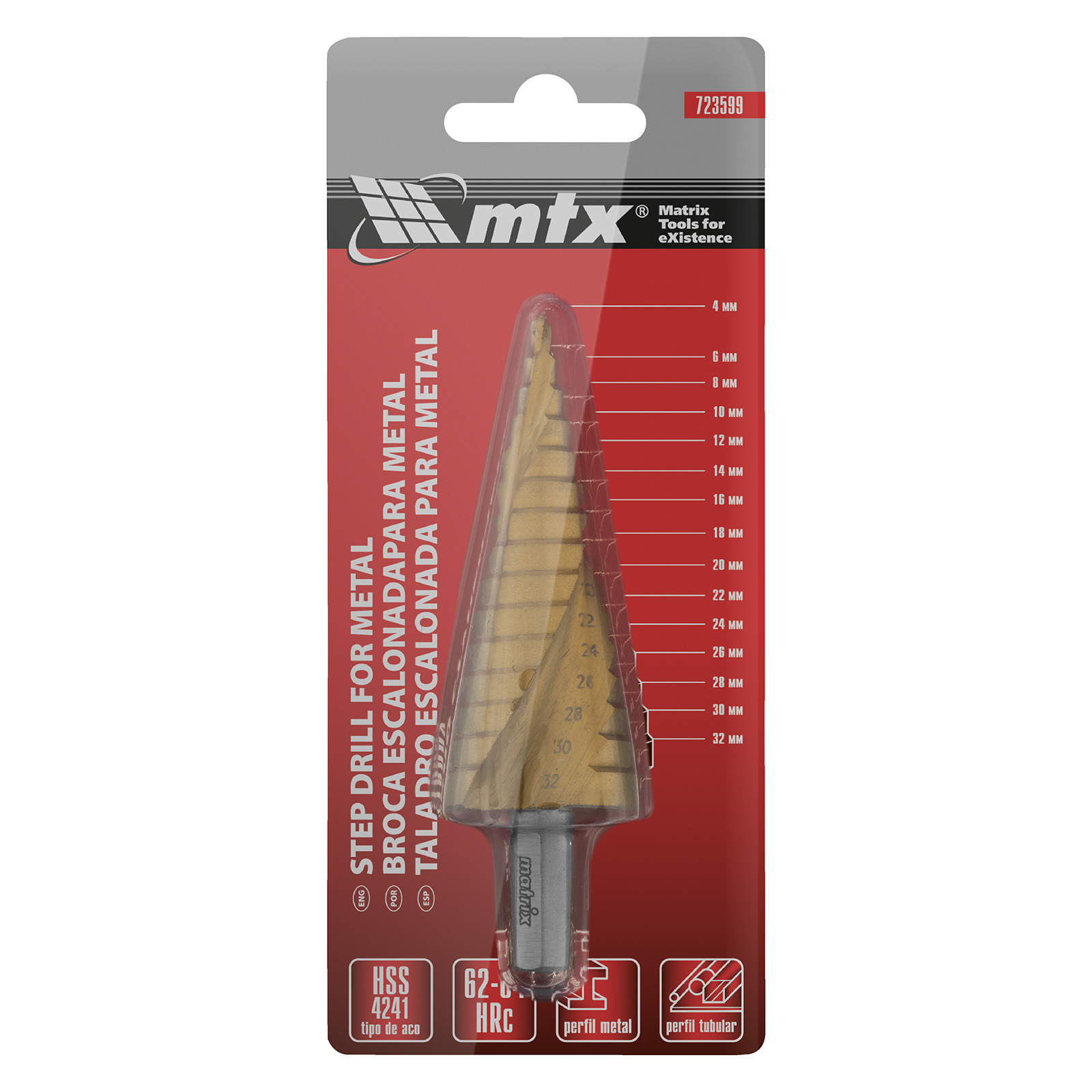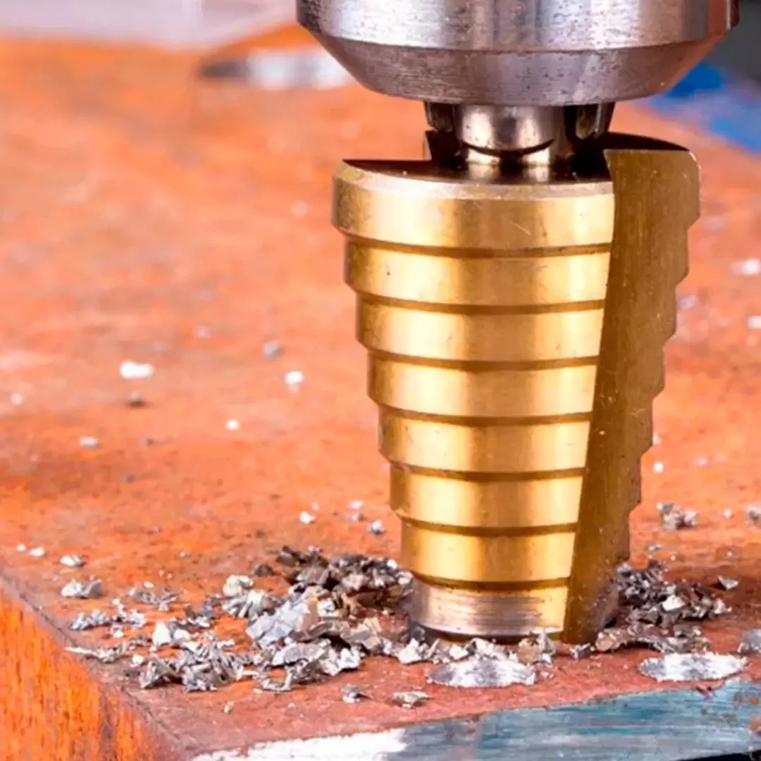 As brocas escalonadas são projetadas para perfurar furos de diferentes diâmetros em chapas e produtos de paredes finas, metais não ferrosos, aço inoxidável e plástico. Cada tamanho seguinte tem uma transição suave na forma de um passo, o que permite obter um furo limpo do diâmetro desejado. Benefícios: Alta precisão ¿¿¿ as bordas do furo são perfeitamente uniformes. Versatilidade ¿¿¿ uma broca substitui toda uma gama de brocas tradicionais. Abordagem integrada ¿¿¿ ao perfurar um furo, é possível remover imediatamente o chanfro.