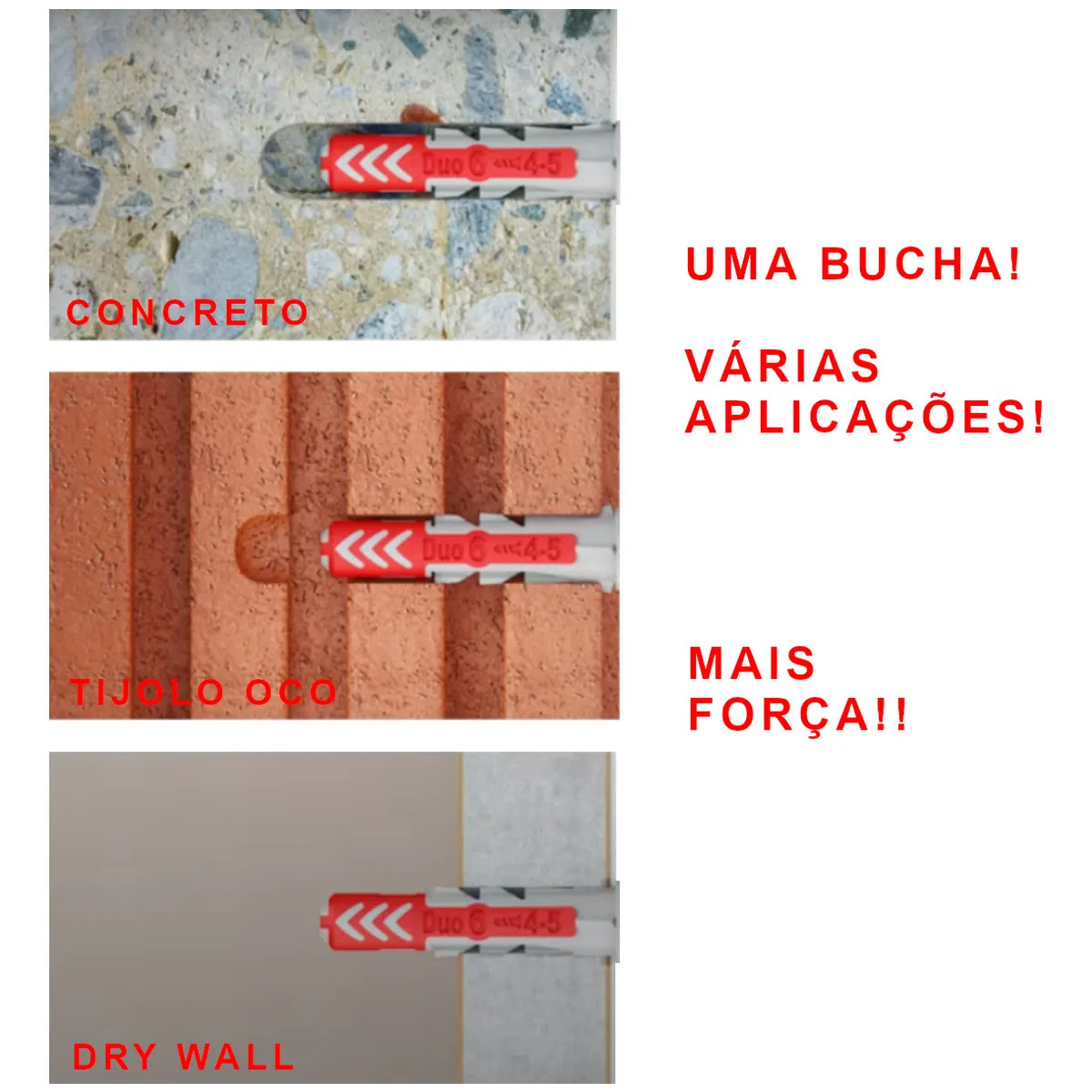 A DuoPower da fischer é uma bucha inteligente de 2 componentes com três princípios de funcionamento. A DuoPower da fischer é ideal para fixações em todos os materiais de construção. Isto permite aplicações muito versáteis com apenas uma bucha. A DuoPower da fischer adapta-se naturalmente ao material e distribui os máximos valores de carga mediante os três princípios funcionais de bloqueio, expansão e torção. Esta resposta perfeita da bucha ao girar do parafuso oferece uma segurança extra adicional. A DuoPower da fischer de 6×50, 8×65 e 10×80 são especialmente apropriadas para fixações em materiais perfurados, concreto poroso e para trabalhos em gesso graças à sua grande profundidade de ancoragem.