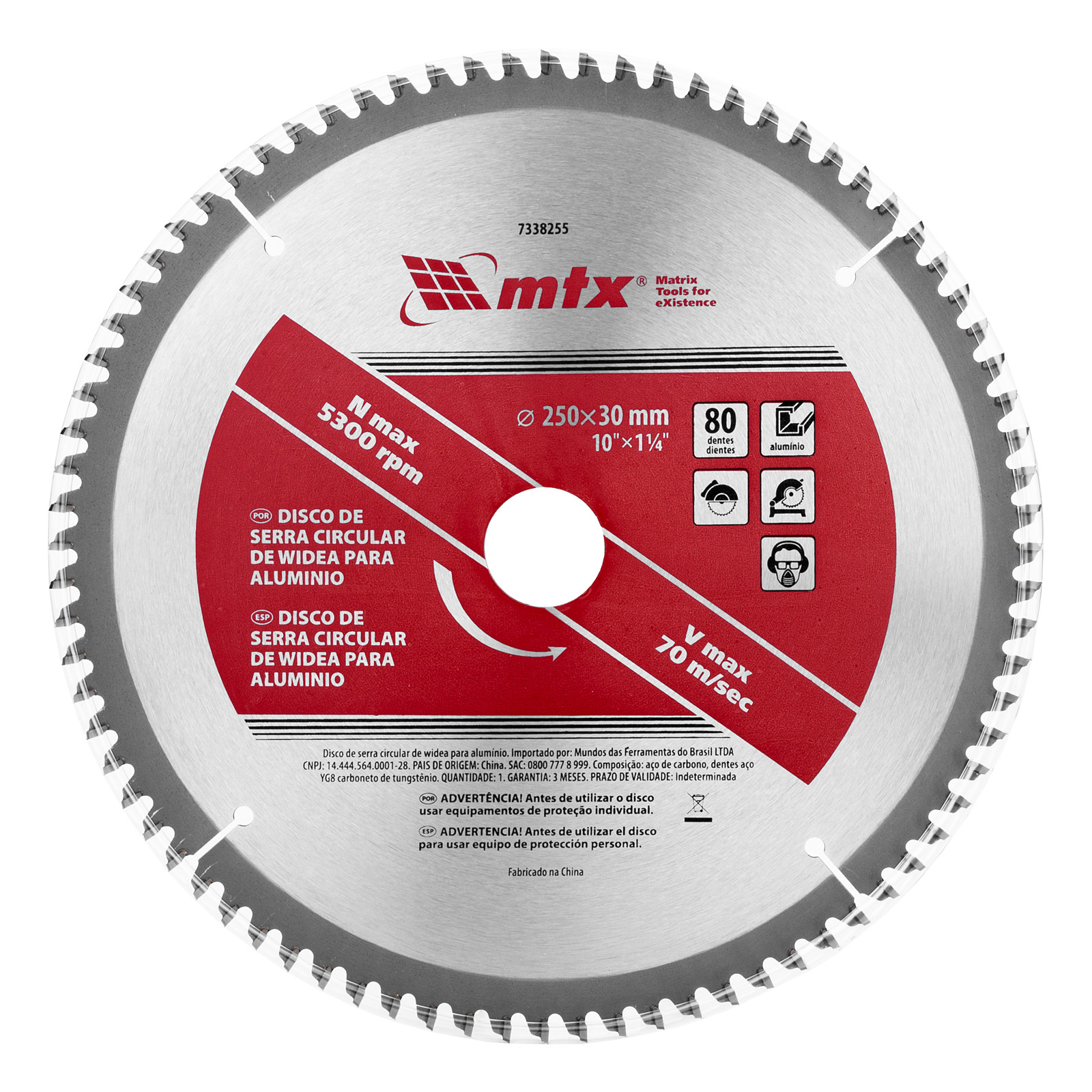 O disco de serra MTX 7338255 com diâmetro de 250 x 30 mm, com 80 dentes e um anel de 5/8″, é projetado para cortar peças de alumínio. Fornece um corte limpo e uniforme sem rebarbas ou lascas. Os dentes são colocados em um ângulo ótimo, o que garante alta produtividade. O disco é instalado em uma serra circular ou de esquadria.