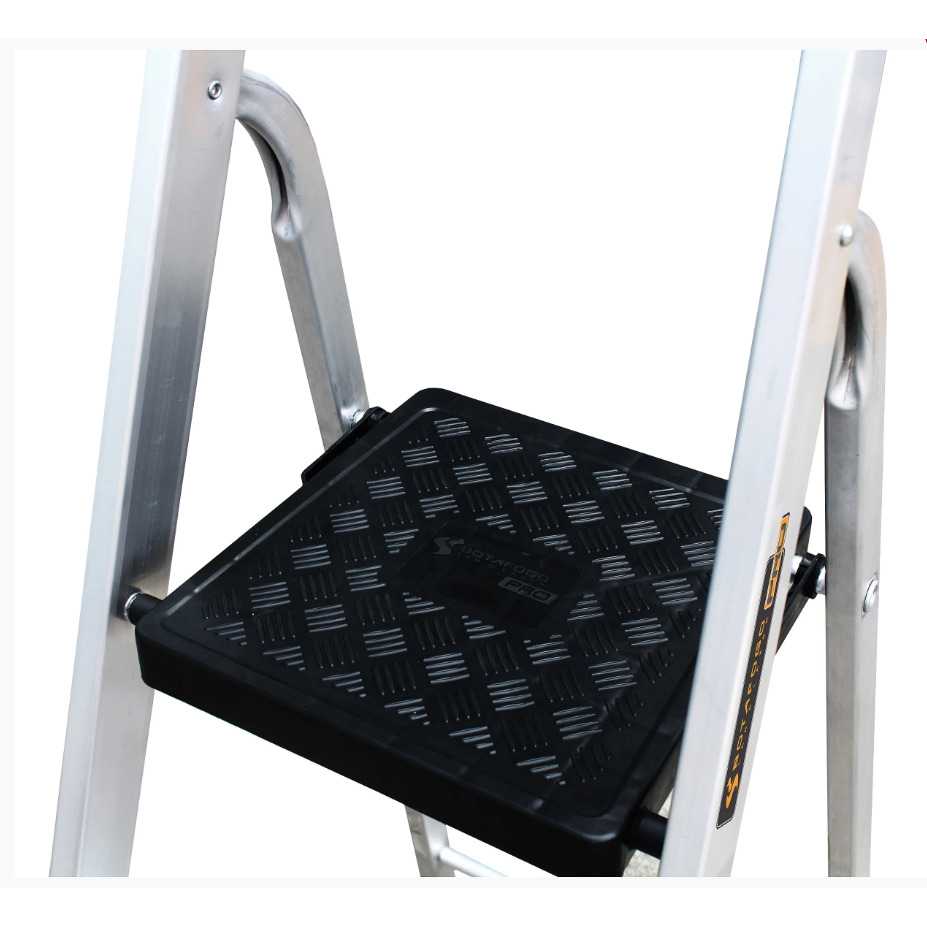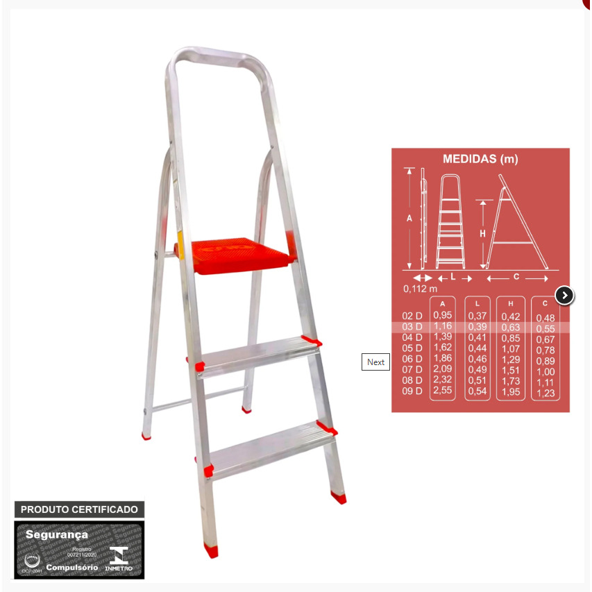 Para quem procura uma escada doméstica com maior capacidade de carga e medidas maiores, apresentamos a Botafogo Pro. Desenvolvida com padrão europeu, é comercializada tanto no mercado interno como no externo. Ela é sinônimo de qualidade. Proporciona maior alcance, conforto e segurança. Alcance, pois seu entre degraus é maior, tornando-a mais alta. Conforto, pois os seus degraus e patamar são maiores que os das escadas convencionais. Mais segurança, pois sua estrutura reforçada faz com que ela suporte até 150kg. Além de possuir um guarda corpo bem maior. Agora, o que é ainda mais bacana nela é o seu suporte de utilidades. Nele podemos apoiar diversas ferramentas, lâmpada e tem até um gancho para pendurar balde. É um produto certificado pelo INMETRO, 100% nacional e sustentável. Já que em seu fim de ciclo pode ser totalmente reciclável. Está disponível de 2 à 7 degraus. E ainda possui incríveis 5 anos de garantia contra defeitos de fabricação.