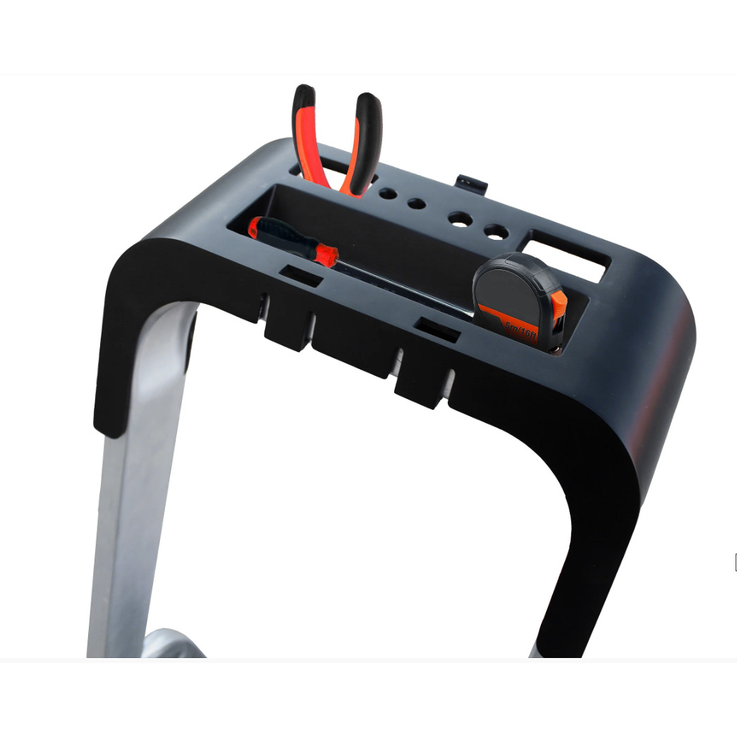 Para quem procura uma escada doméstica com maior capacidade de carga e medidas maiores, apresentamos a Botafogo Pro. Desenvolvida com padrão europeu, é comercializada tanto no mercado interno como no externo. Ela é sinônimo de qualidade. Proporciona maior alcance, conforto e segurança. Alcance, pois seu entre degraus é maior, tornando-a mais alta. Conforto, pois os seus degraus e patamar são maiores que os das escadas convencionais. Mais segurança, pois sua estrutura reforçada faz com que ela suporte até 150kg. Além de possuir um guarda corpo bem maior. Agora, o que é ainda mais bacana nela é o seu suporte de utilidades. Nele podemos apoiar diversas ferramentas, lâmpada e tem até um gancho para pendurar balde. É um produto certificado pelo INMETRO, 100% nacional e sustentável. Já que em seu fim de ciclo pode ser totalmente reciclável. Está disponível de 2 à 7 degraus. E ainda possui incríveis 5 anos de garantia contra defeitos de fabricação.