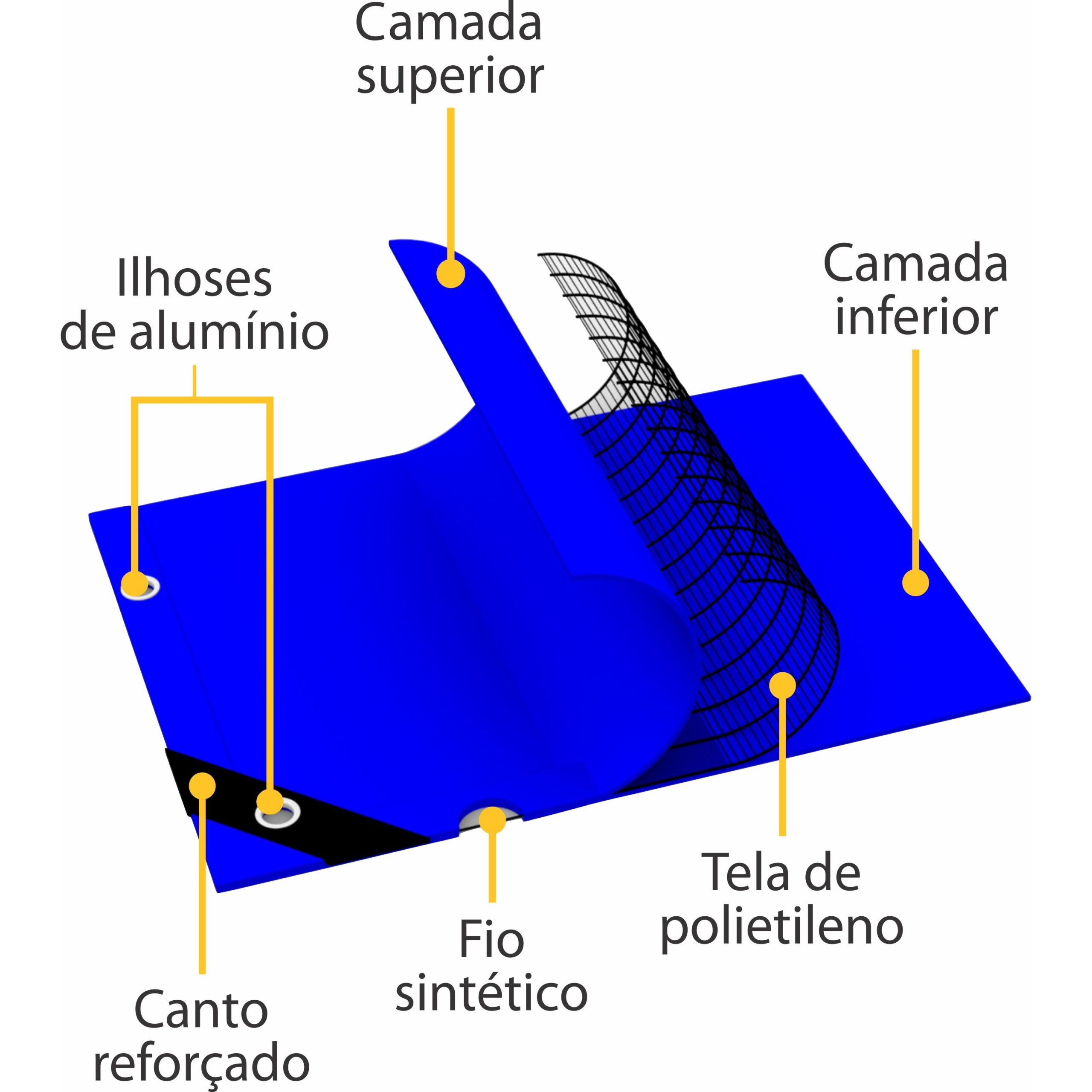 Cantos reforçados. Cor azul Ilhós de alumínio a cada metro