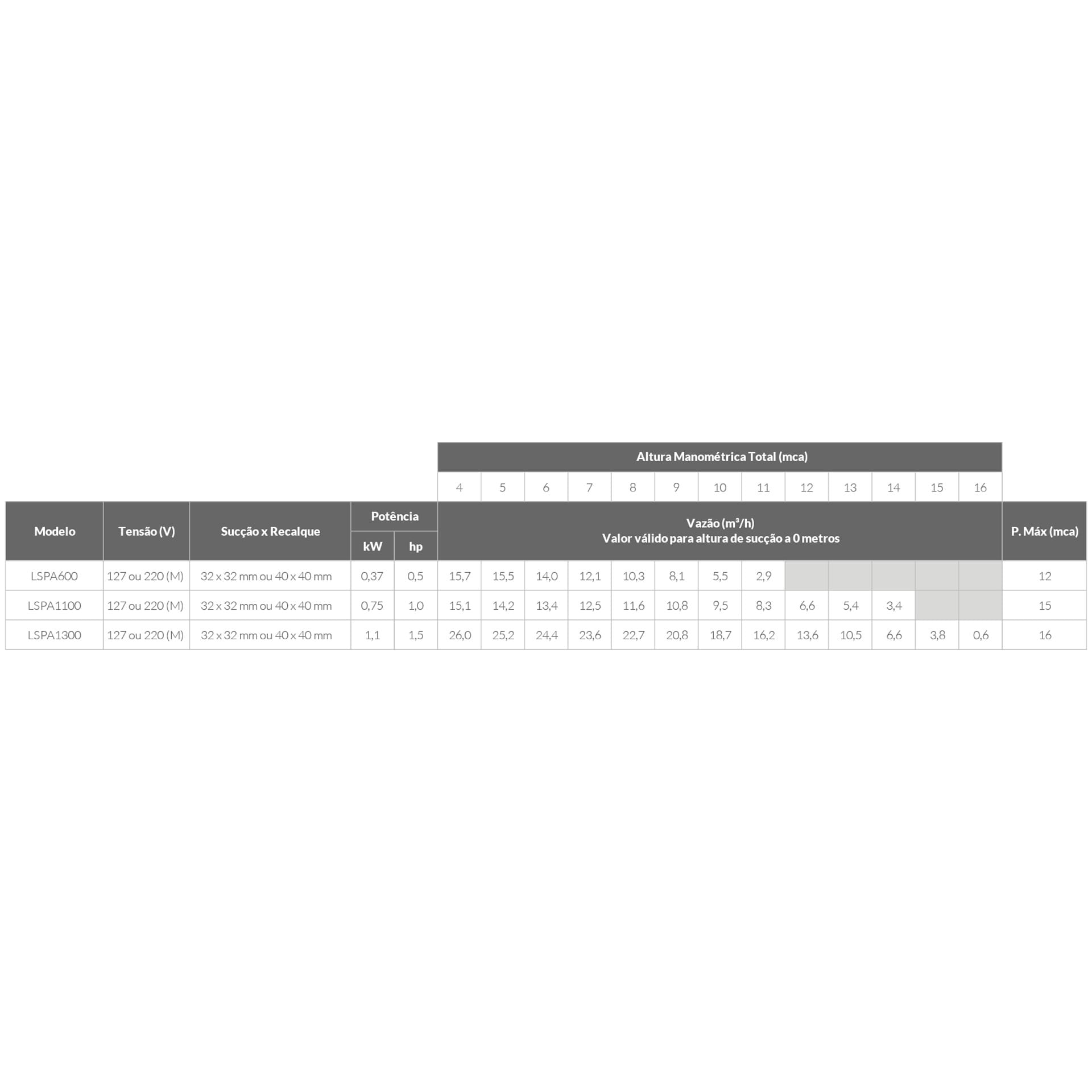 – Pressão máxima de trabalho: 30 mca