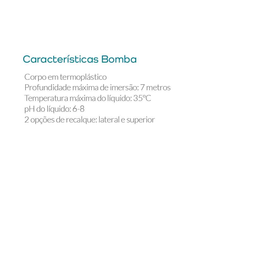 Utilizada em drenagens residenciais leves (cisternas de água limpa – fria e isenta de sólidos – pequenas piscinas).