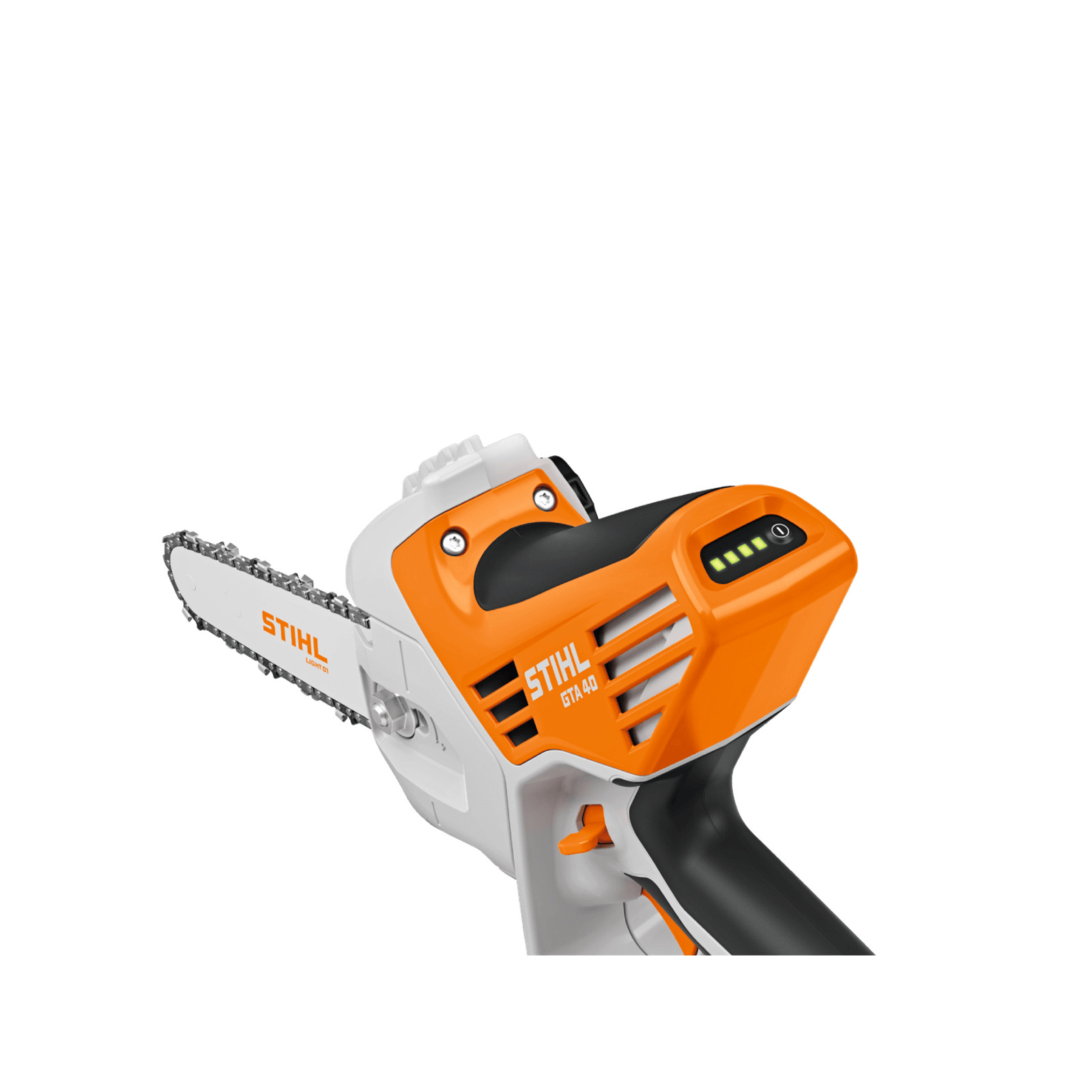 Entre os recursos avançados estão o acionamento mecânico bilateral, controle de velocidade variável, tensionamento lateral da corrente e indicador de carga por LED, que tornam o uso mais intuitivo e eficiente. Para trabalhos em altura, os olhais de aço laterais permitem a fixação segura de sistemas de retenção. Desenvolvido para uso profissional contínuo, o STIHL GTA 40 possui certificação IPX4, garantindo resistência a respingos de água tanto no equipamento quanto nas baterias, mesmo em condições climáticas adversas.