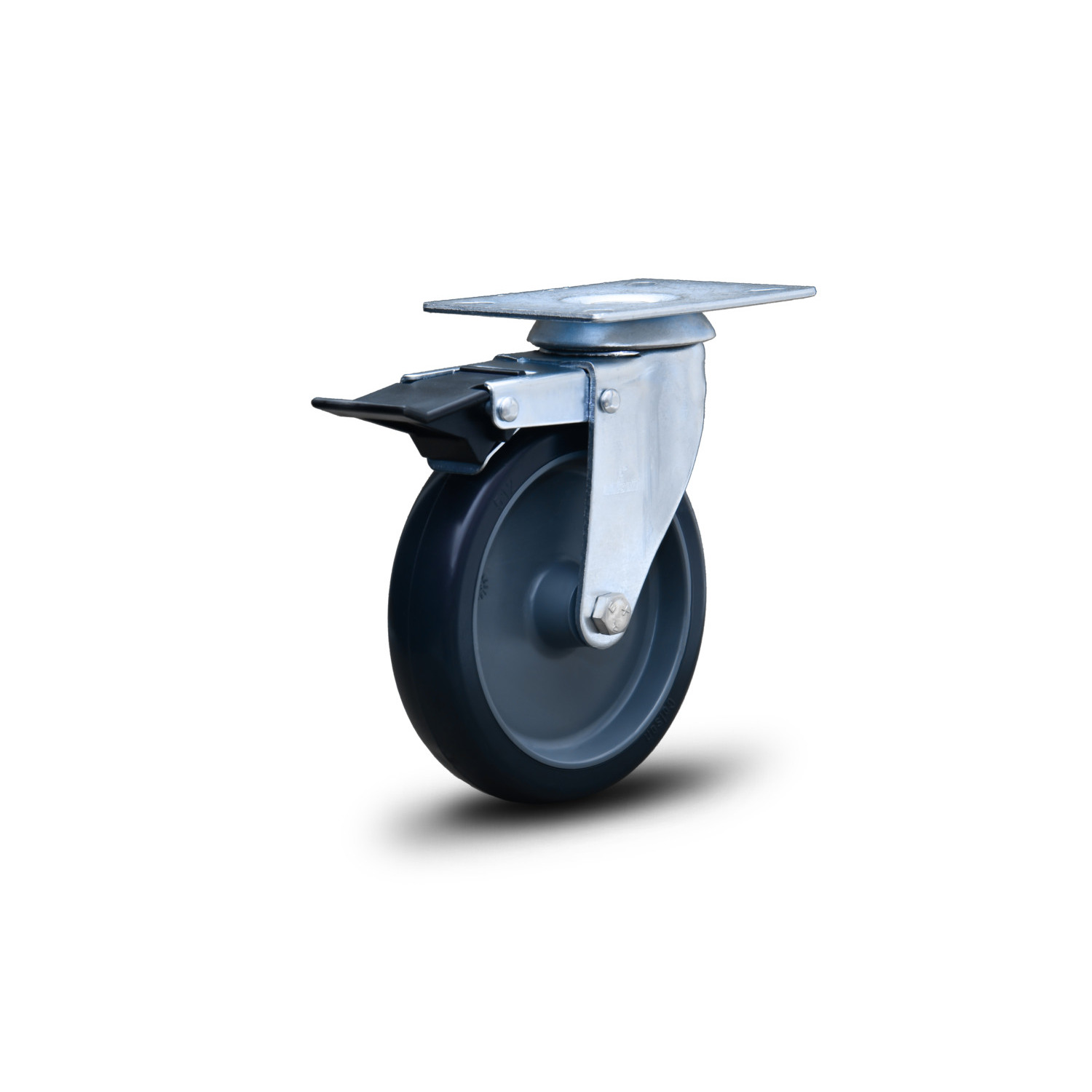 Rodízios em aço com dupla pista de esferas e acabamentozincado, disponível com rodas de resina termoplástica macia com núcleo em polipropileno.