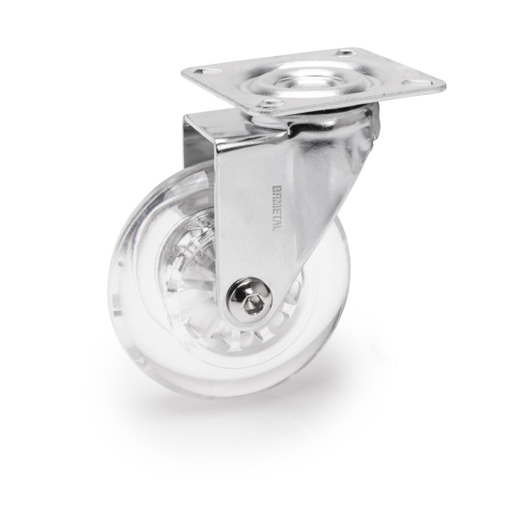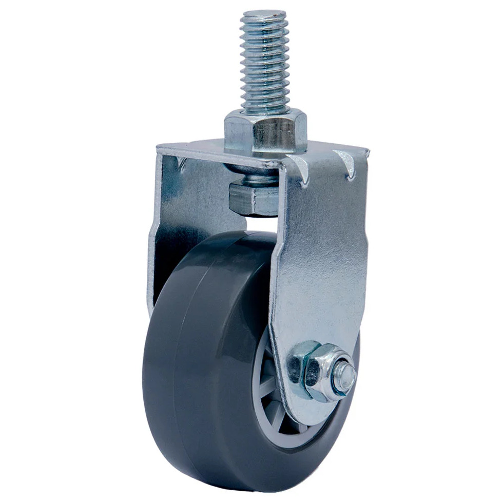 Rodízios com design inovador alinhado com resistência e conforto. Fabricados em aço com acabamento em pintura epóxi preta e roda com núcleo em polipropileno preto. Possui banda em PVC preto, com duplo rolamento de esferas de precisão, o que melhora muito o desempenho do rodízio.
