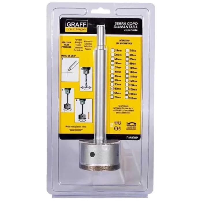 A Serra Copo Diamantada é uma ferramenta desenvolvida para perfurar e criar buracos bem definidos em superfícies como concreto, alvenaria, entre outros. – Aplicação: Construção Civil/ Alvenaria – Especificações técnicas: Dimensões da Embalagem: 55x160x295 mm Peso: 0,558g Bitola (mm): 60,0Referência: 574,0010Marca: Graff Vantage A Serra Copo Diamantada é uma ferramenta desenvolvida para perfurar e criar buracos bem definidos em superfícies como concreto, alvenaria, entre outros.